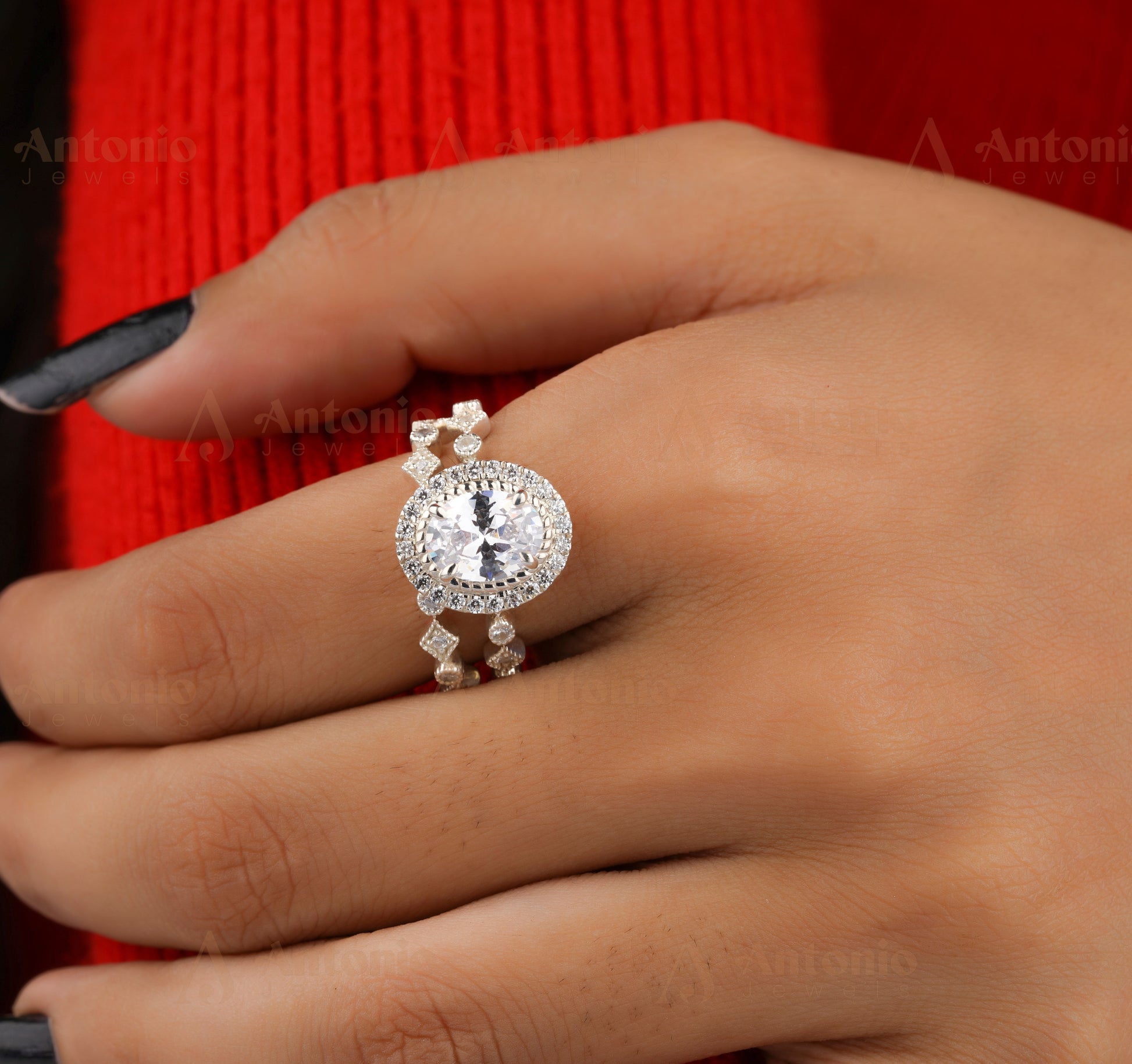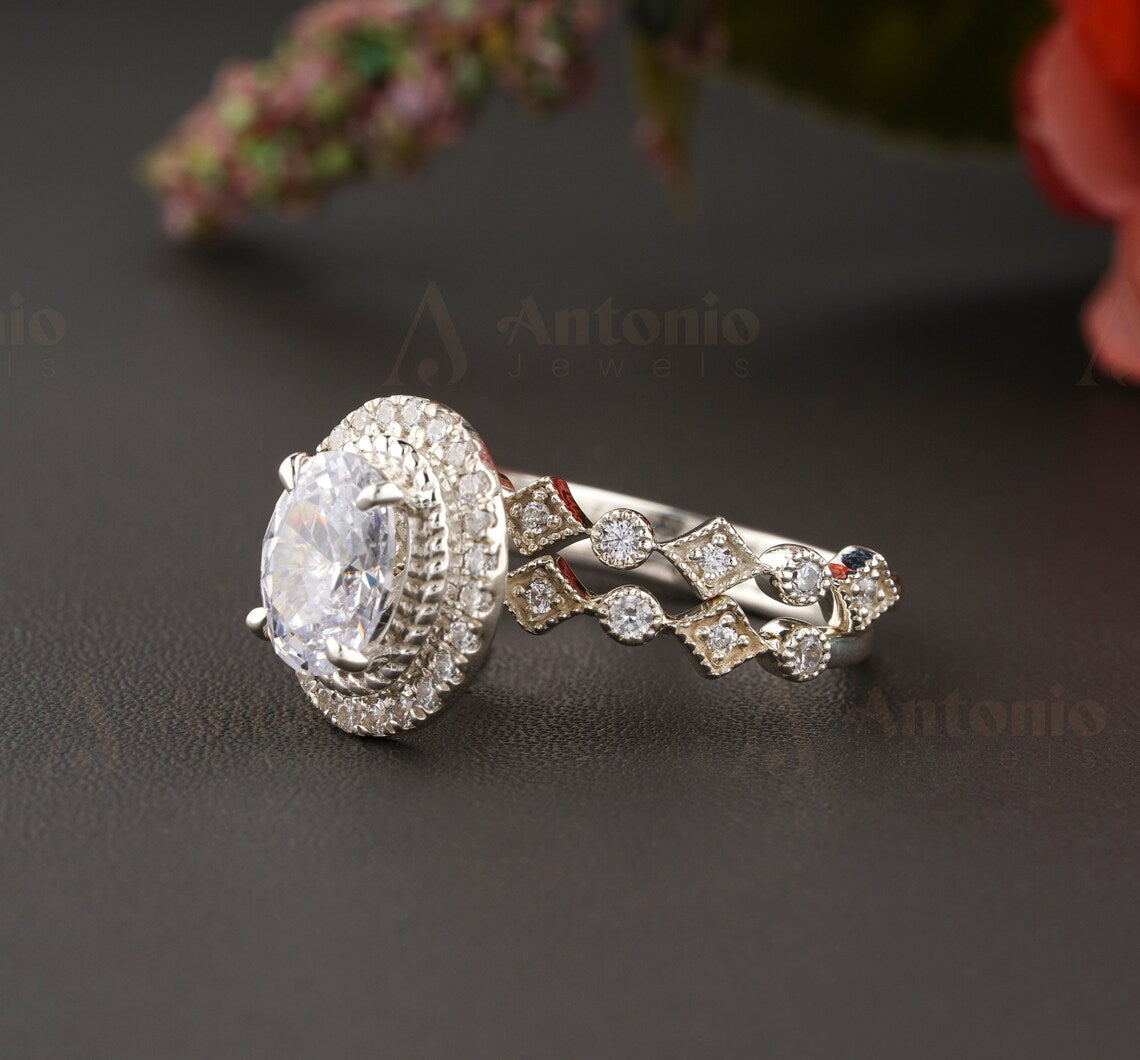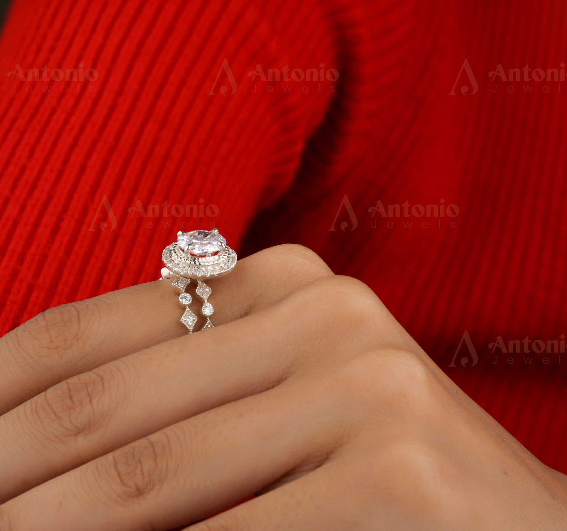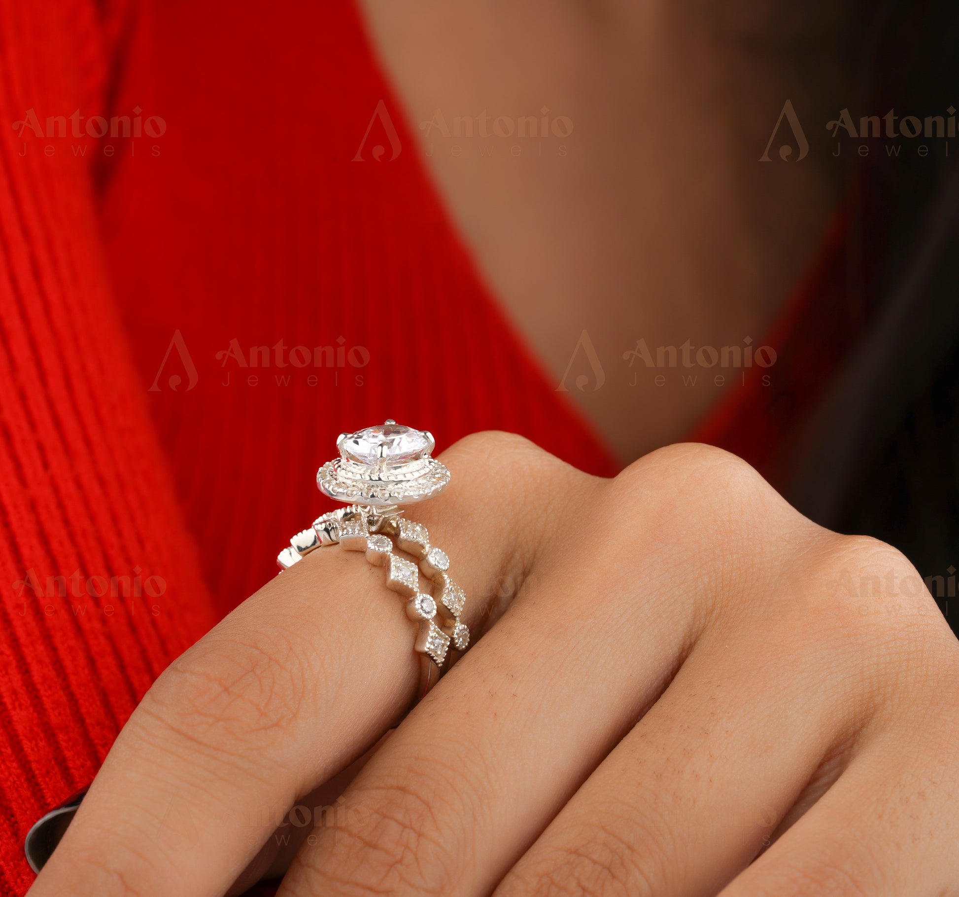 Halo Oval Moissanite Diamond Engagement Ring Set